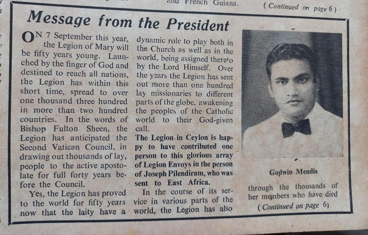 And now, on the 10 Death Anniversary of Godwin Mendis, the legion of Mary in Sri Lanka and MAW SEVANA acknowledge their debt of gratitude to him, the Founder, and pay a tribute to him for his pioneering work.